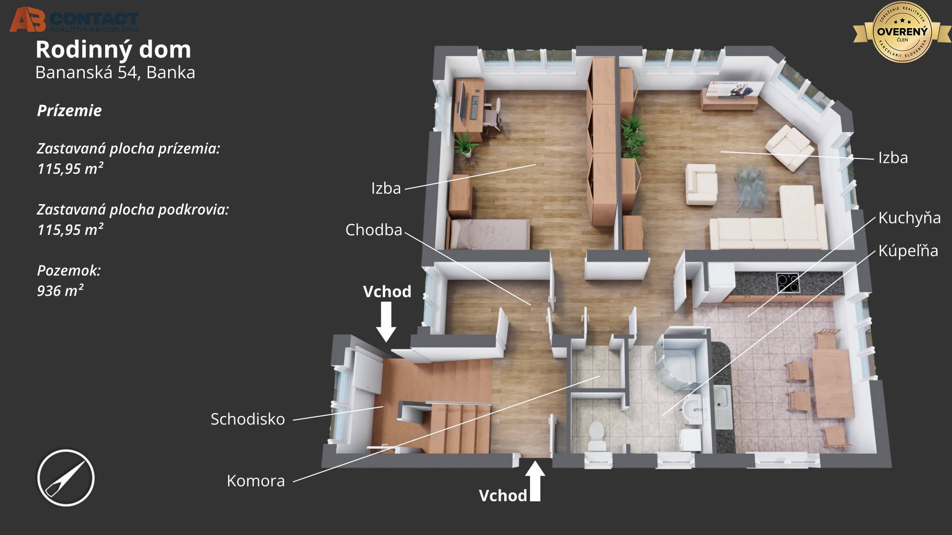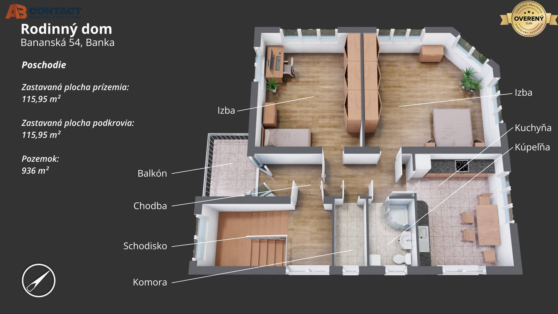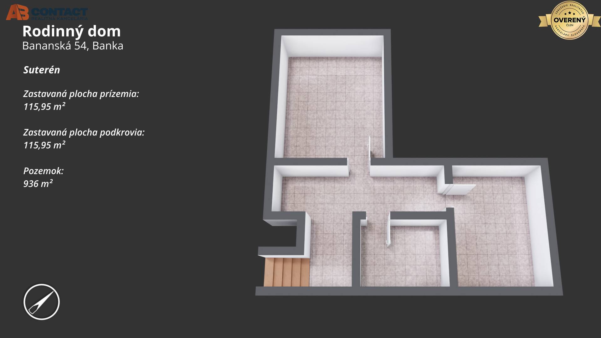 Pôvodný rožný rodinný dom v obci Banka. Nachádza na rohu ulíc Bananská/Žiacka na pozemku o celkovej výmere 936 m². Rodinný dom má dve nadzemné podlažia, suterén a povalu. Dom má dva vstupy a centrálne schodisko, pozemok je...